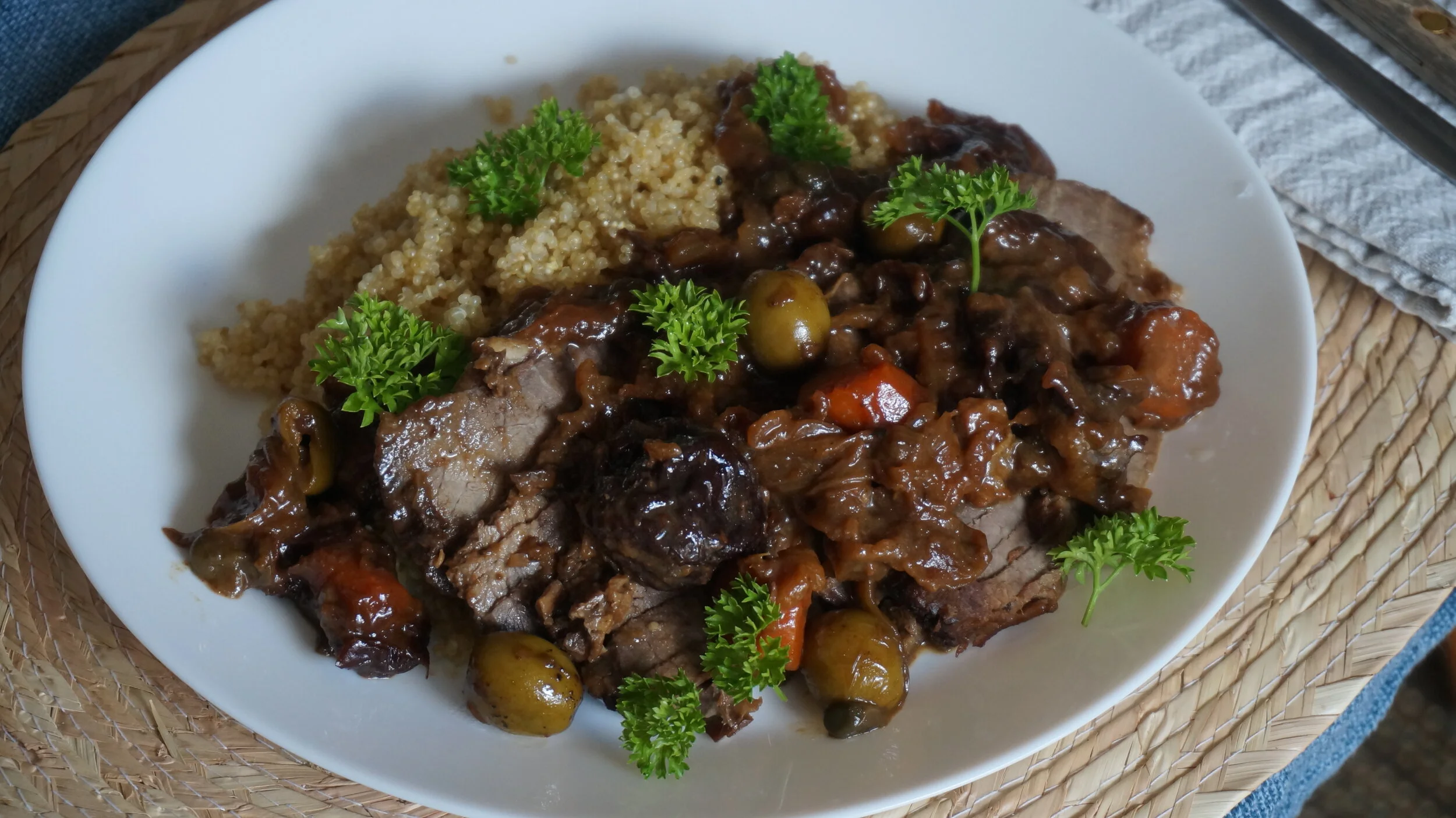 Remove from the oven. Place brisket onto a serving platter and scatter fruits and vegetables around the brisket. Serve on top of a bed of cooked cous cous or quinoa and garnish with parsley.