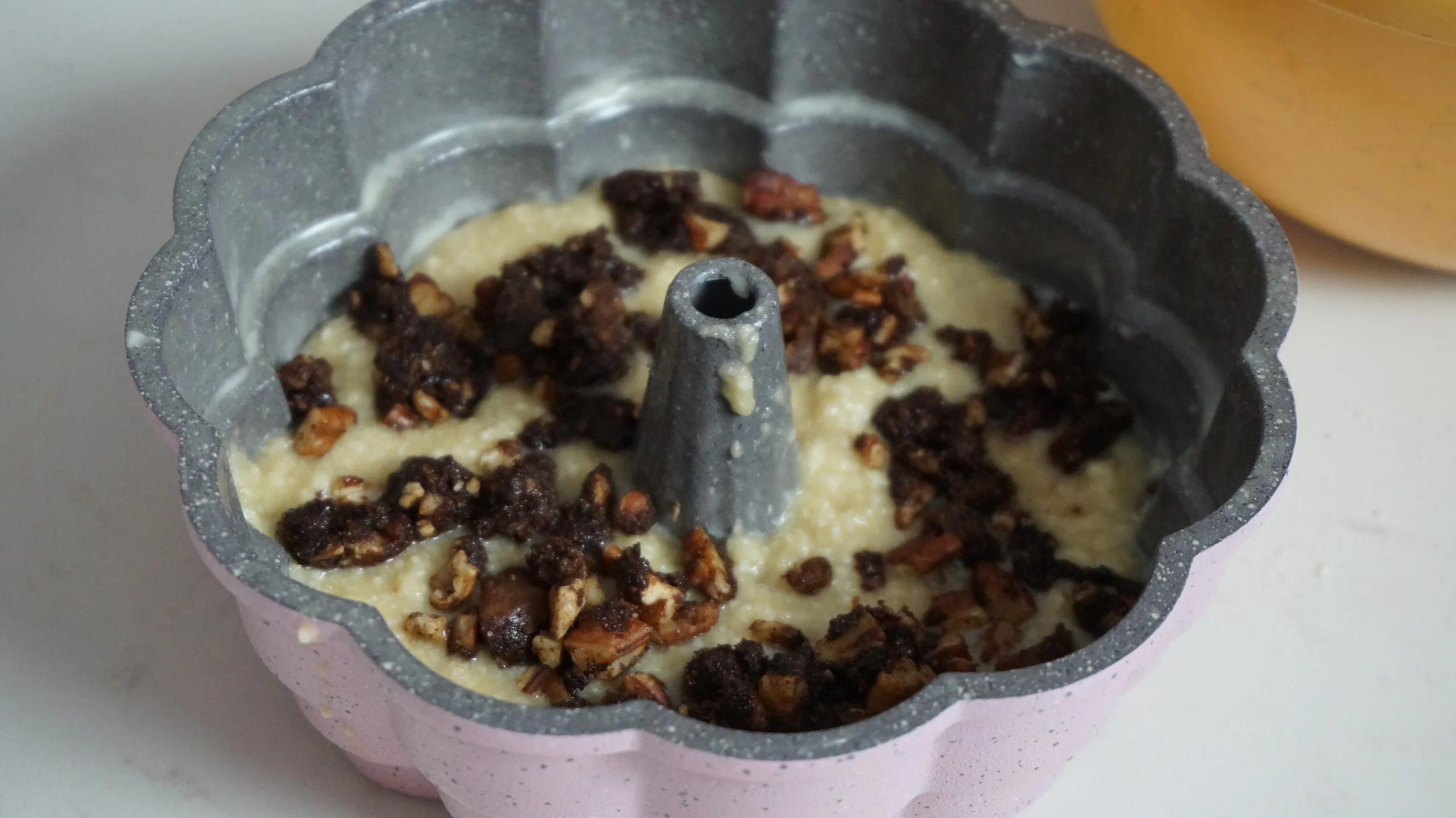Spoon in half of the cake batter, sprinkle filling ingredients over the batter that is in the bundt, and then cover it with the remaining cake batter.