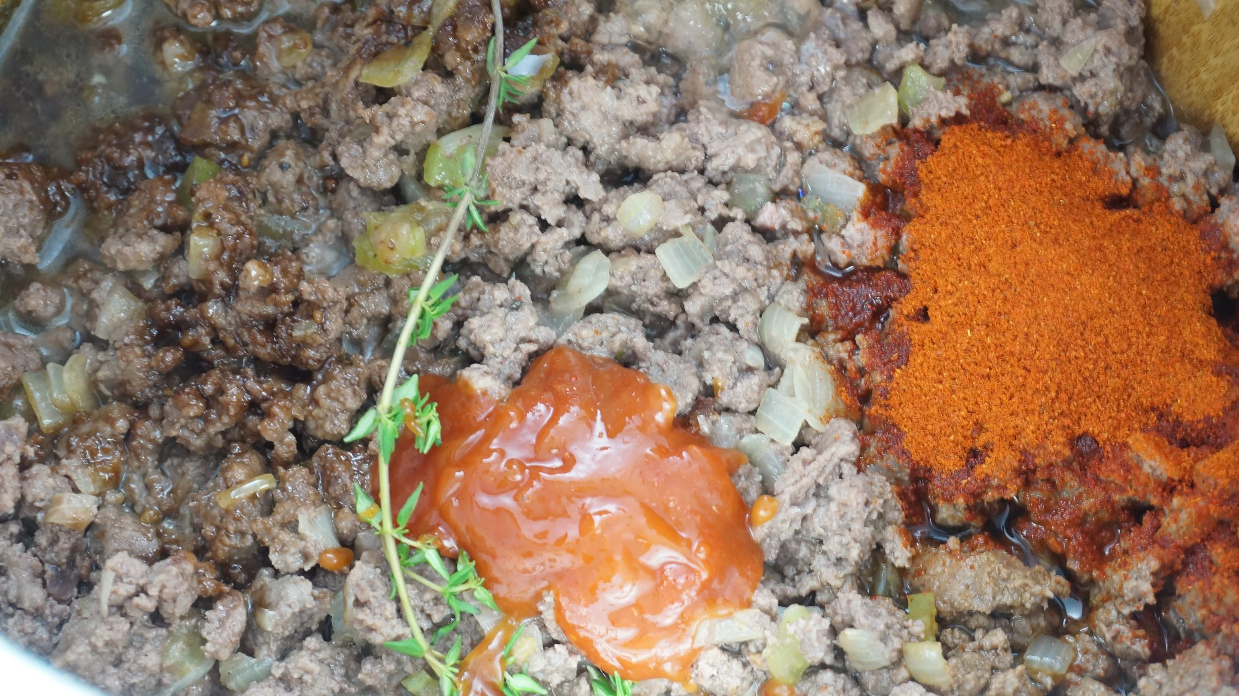 Stir in chopped tomato, ketchup, sriracha, brown sugar, vinegar, Worcestershire sauce, paprika and thyme. Cover and pressure cook for 10 minutes.